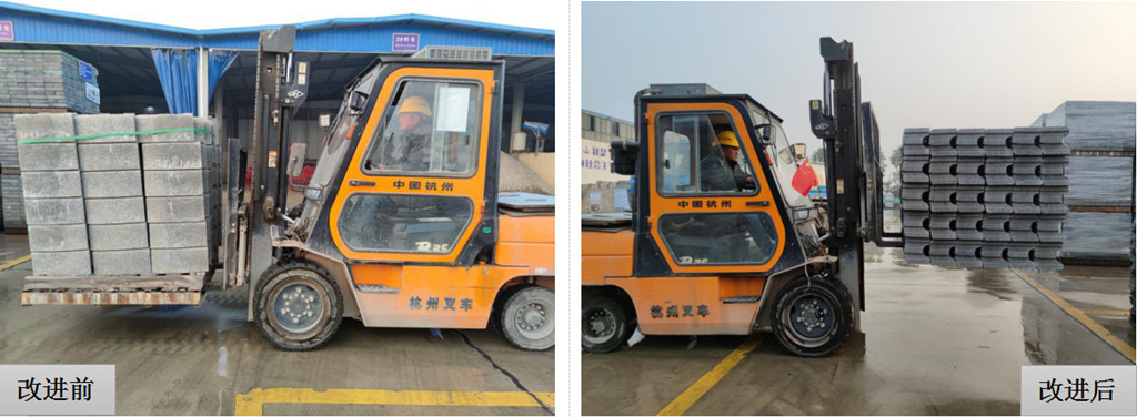 改进措施的第一步是调整再生制品的码垛方式,在原有码垛的基础上,利用再生制品本身的孔洞,交叉穿插绑扎钢带,起到稳固、防止制品翻倒倾斜的作用。改进的第二步是缩小叉车的货叉尺寸,将原本120mm宽的货叉,改为80mm宽,改进后的货叉在保证其原有功能的基础上,能有效插入再生制品预留孔洞中,可直接利用叉车将打包好的检查井模块砖、水工砖等制品搬运到翻板机上进行90度翻转,实现免托盘打包码垛,随后进入成品堆放区进行室外养护。经过近半个月的工作实践,这两步小小的改动,成功适用于新材料公司生产的环保再生检查井模块砖和水工砖。